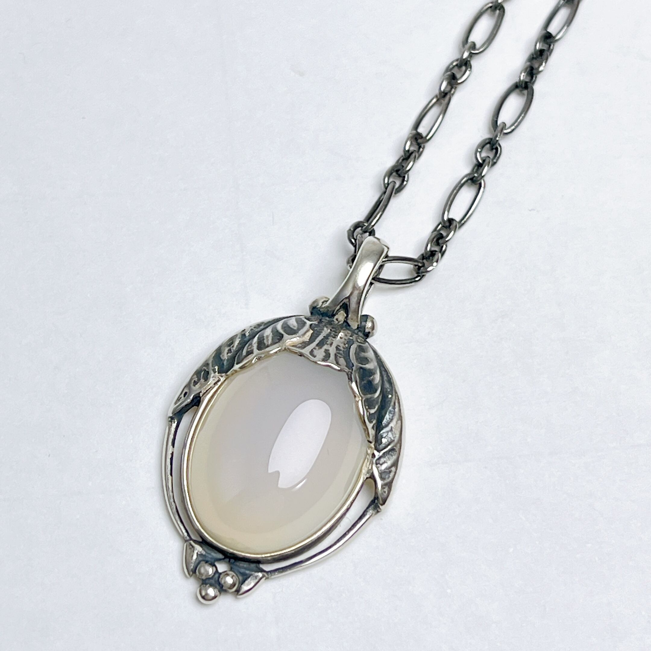 有機的で洗練されたシルエットに、ミルキーな美しさのホワイトアゲイトがあしらわれた上品なデザイン。アール・ヌーヴォーの伝統を感じさせる曲線美が魅力的で、シンプルながらも存在感のある一品です。