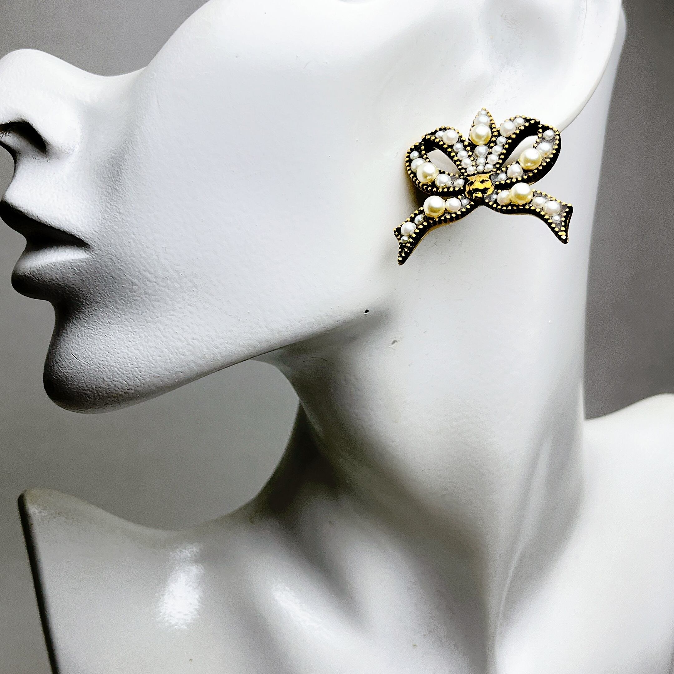 1974 グッチ キャット リボン パール ピアス ゴールド