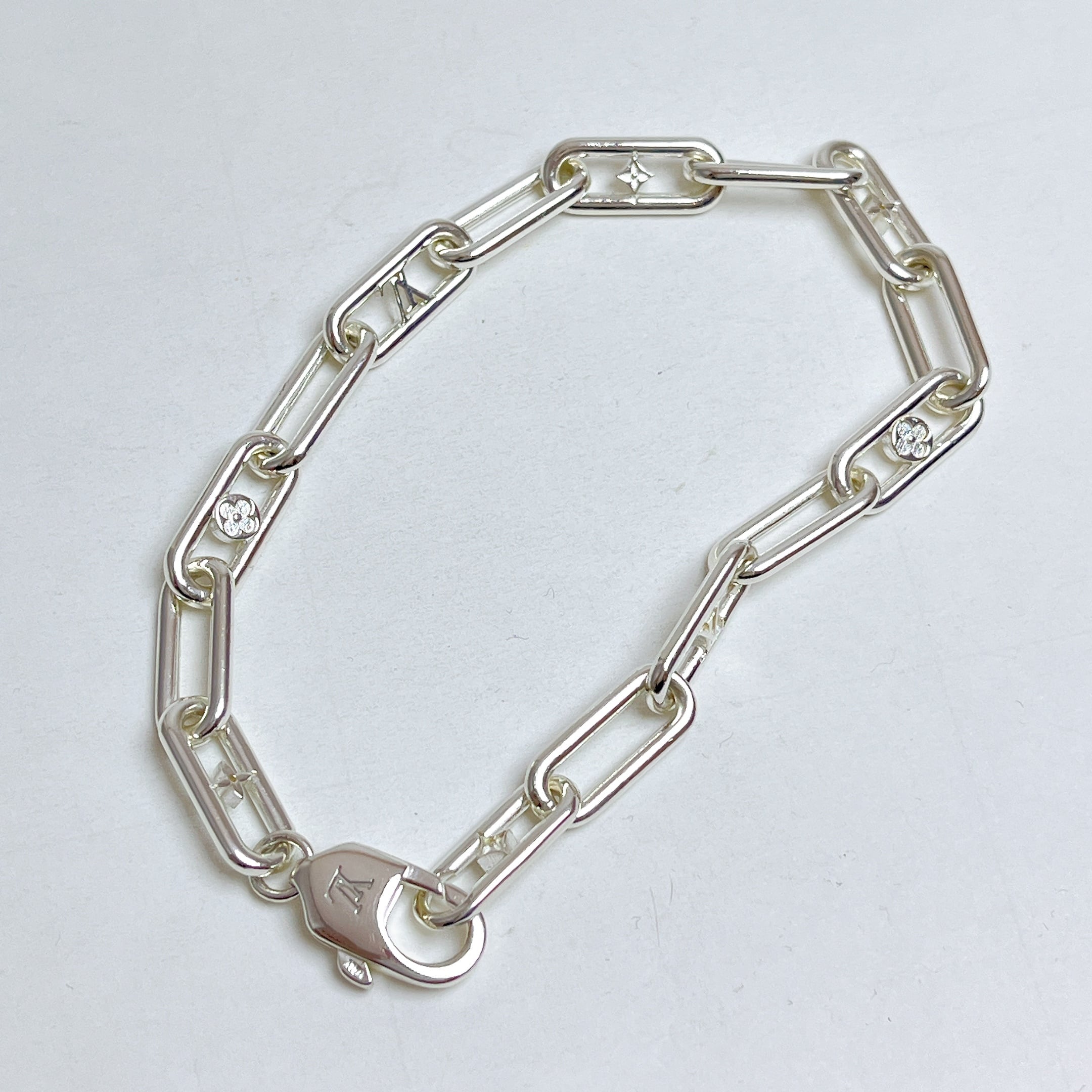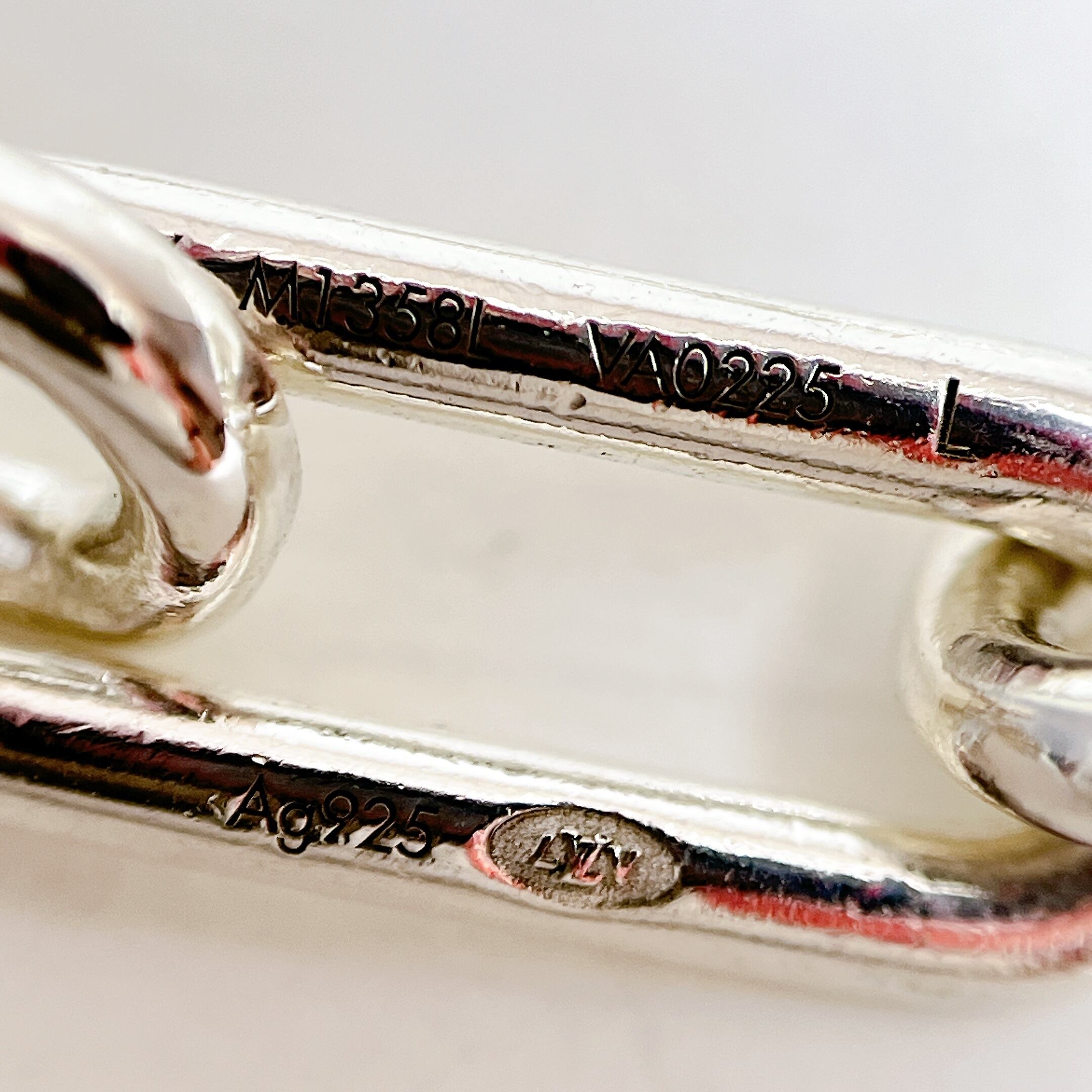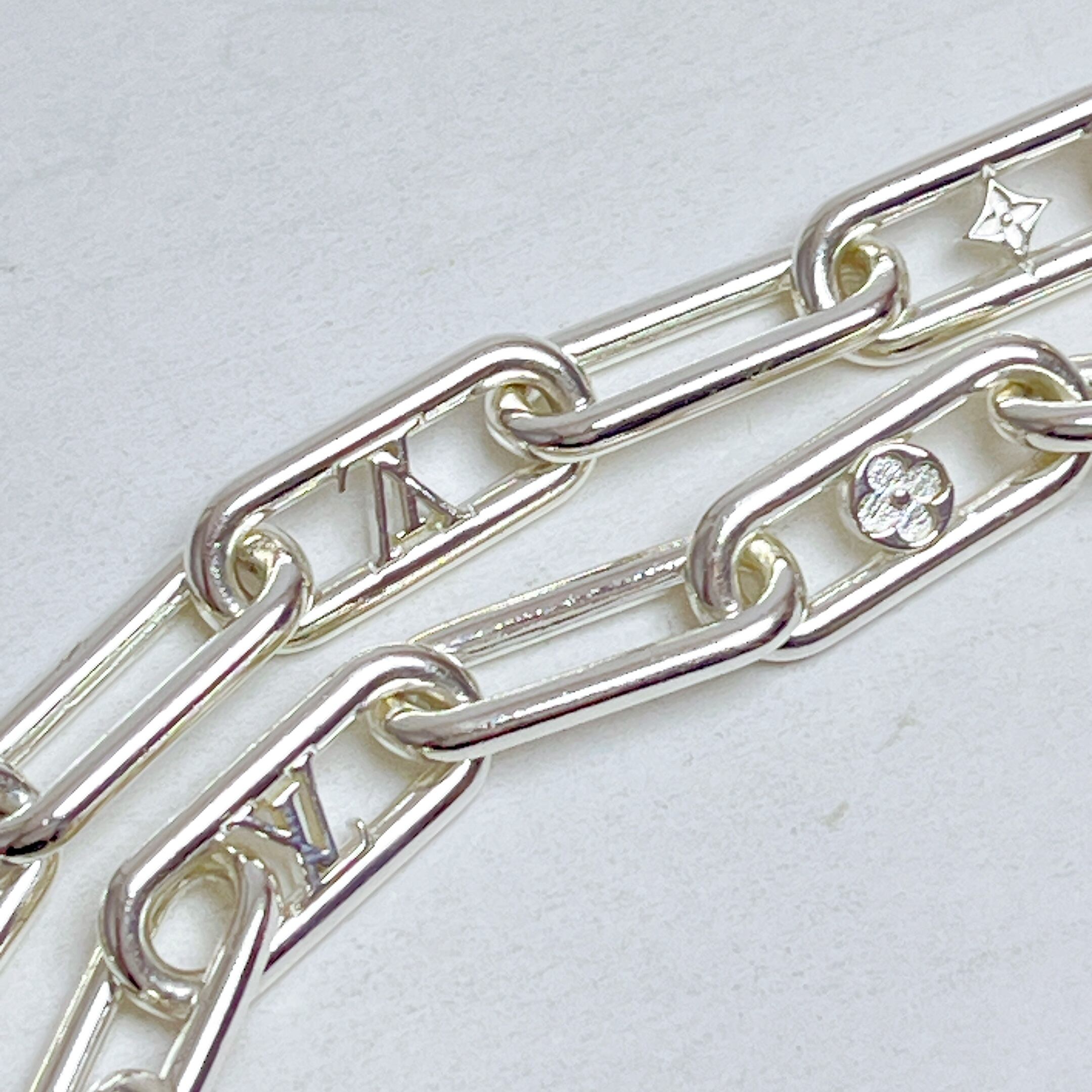 商品説明:ルイ・ヴィトンの「スリーク モノグラム ブレスレット(型番 M1358L)」は、スターリングシルバー(SV925)を使用した高級感あふれるジュエリーアイテムです。鏡面のようなポリッシュ仕上げが施され、リンクチェーンの各コマにはブランドを象徴するモノグラムモチーフがデザインされています。シルバーの艶やかさとアイコニックな意匠が調和し、シンプルながら存在感のある仕上がりとなっています。