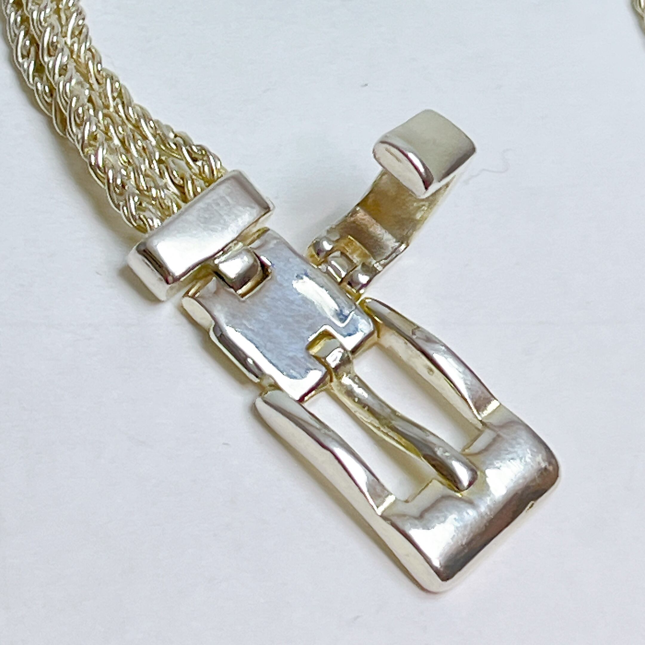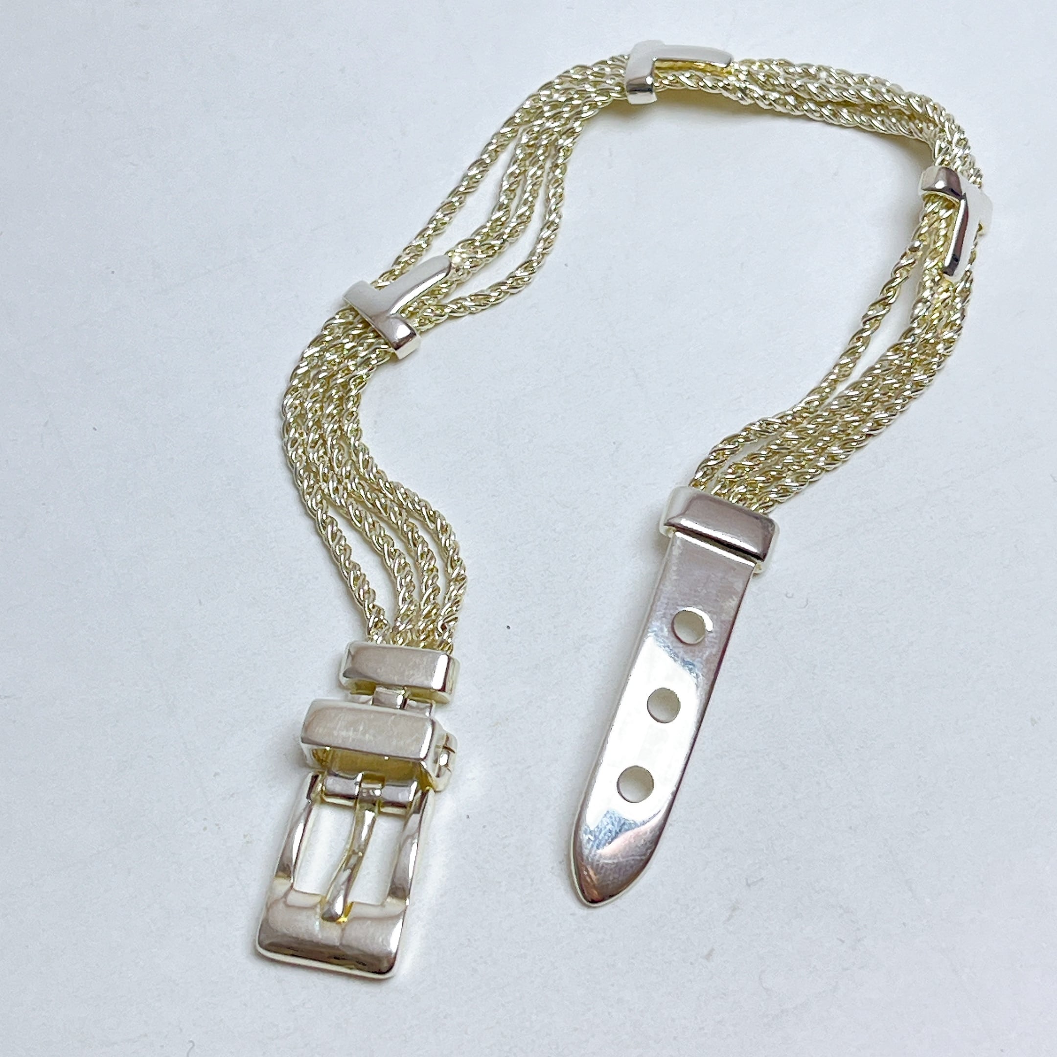 スターリングシルバー(SV925)製の上質な輝きと、存在感のあるバックルモチーフが特徴で、シンプルながら手元に洗練されたアクセントを与えてくれる逸品です。