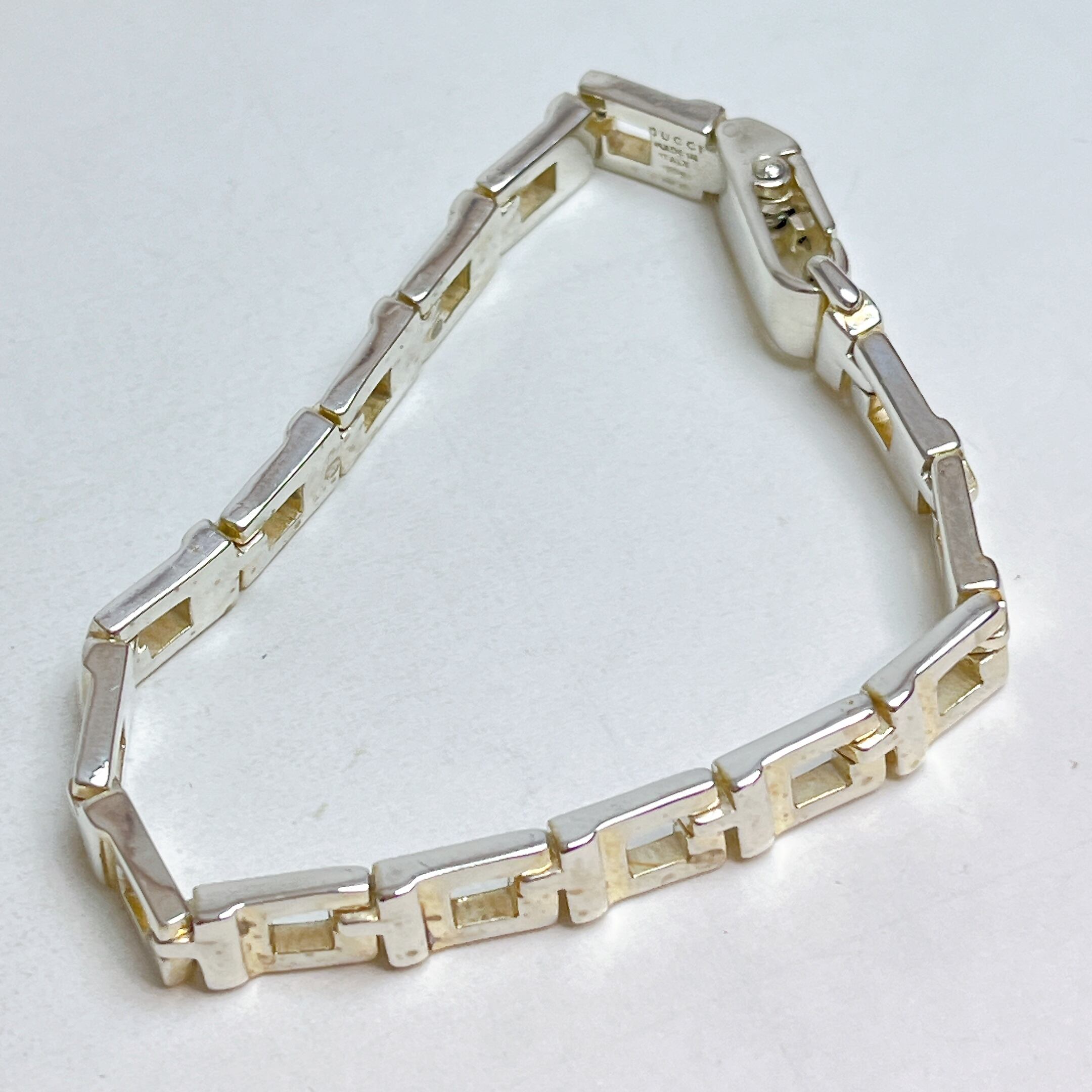 商品説明:グッチのアイコニックな「G」シェイプデザインを採用した、存在感のあるシルバーブレスレットです。シンプルながらもブランドらしいエッジの効いたスタイリッシュな仕上がりで、手元のアクセントとして活躍する人気アイテム。ユニセックスで着用可能なデザインです。